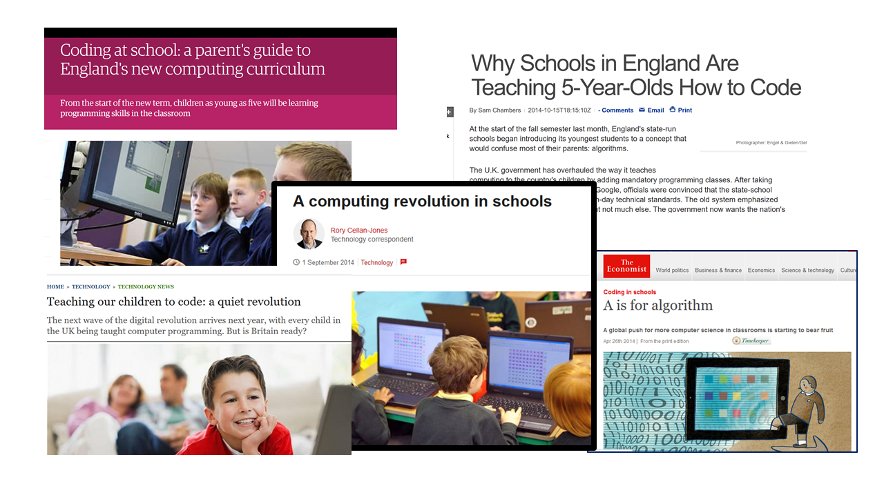 Figure 1: Selection of media articles from 2013 and 2014 about the new Computing curriculum for England